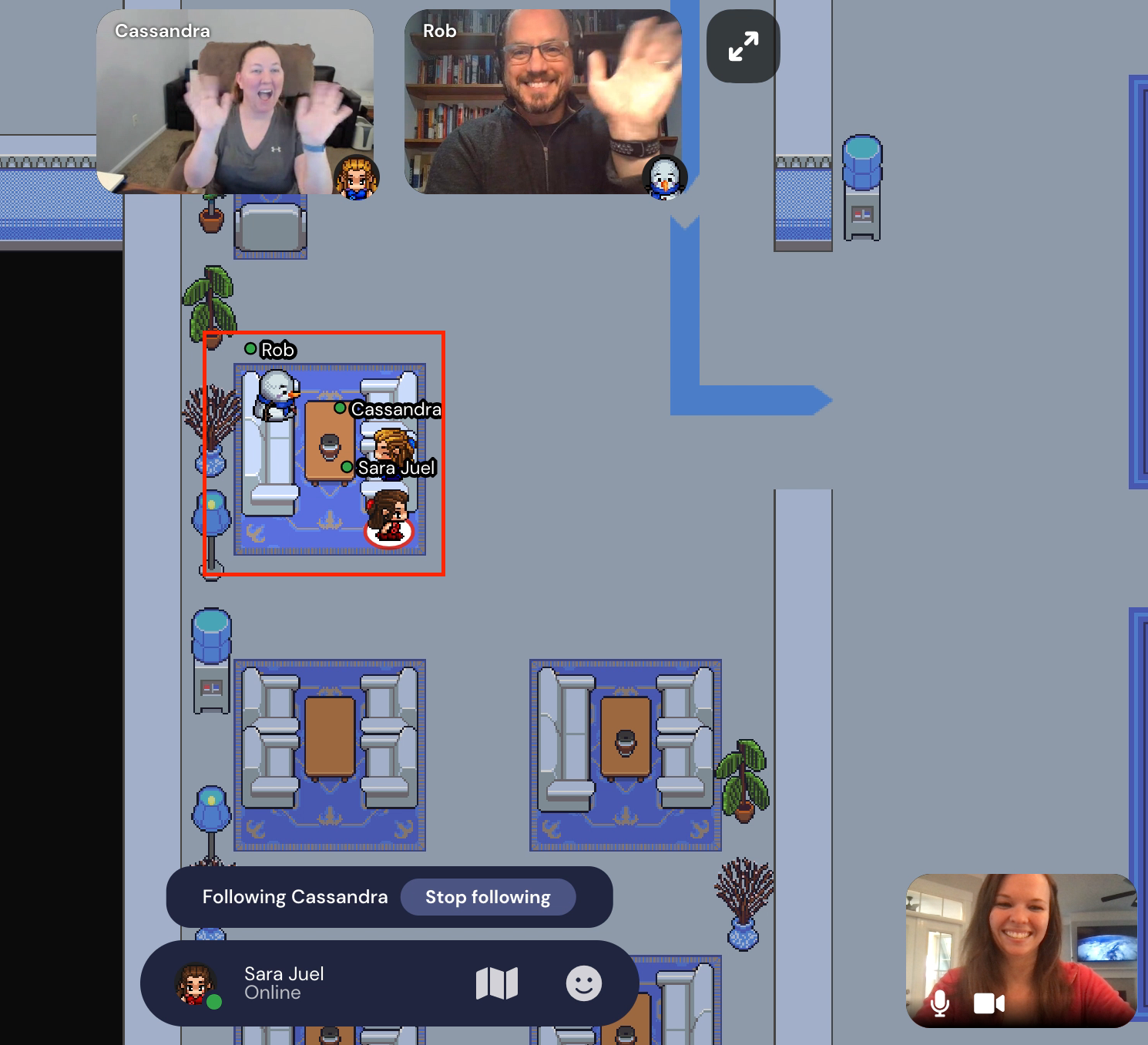 This right here is the bread and butter of Gather! The private video chat replicates the sense of presence you get when you're at a real in-person event. In the Virtual Atlas Events Center, you can only see another person's video-chat feed and hear their voice when your avatar moves close to theirs or is in a private space with the other person(s). This allows you to stop for a chat after a presentation, catch up with a colleague you haven't seen in a while, or even meet some new faces you bump into along the way.