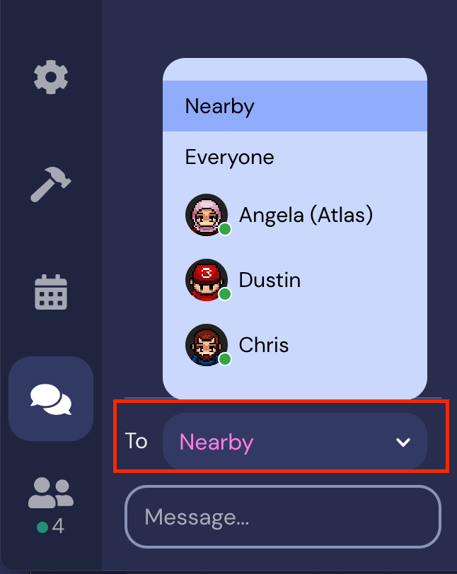 Messages can be sent to everyone in the chat panel (this is only recommended for event-wide notices such as raffle announcements), nearby (users in interactive distance or in a private space), and individuals.